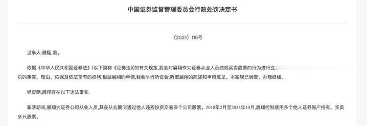 根据处罚决定书内容,案涉期间,展翔为证券公司从业人员,其在从业期间通过他人违规投资交易多个公司股票。2018年2月至2024年10月,展翔控制使用多个他人证券账户持有、买卖多只股票。